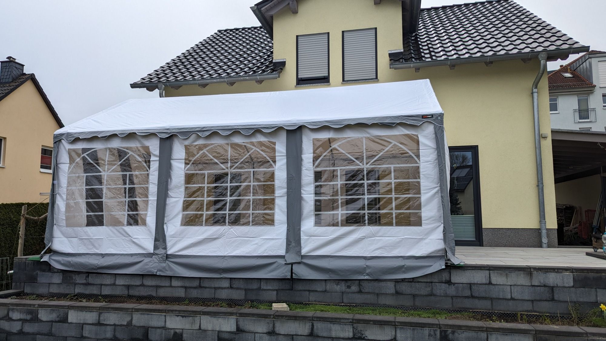 Dieses Partyzelt verfügt über ein leicht montierbares Gestänge aus Stahl (38mm) mit durchgesteckter Schraubverbindung und über ca. 700 g/m² schwere PVC-Planen. Die PVC-Planen bieten einen hohen Lichtschutzfaktor von 80+ und sind 100% wasserdicht. Die Seitenteile lassen sich im 2 m Abstand einzeln anbringen und ermöglichen dadurch viele Aufbauvarianten. Zusätzlich verfügt das Zelt an den Giebelseiten über 2 hochrollbare Eingänge.